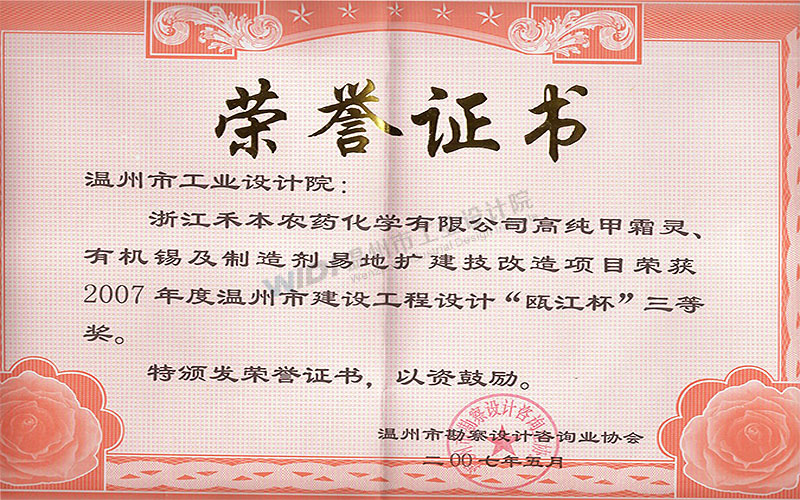 浙江禾本農(nóng)藥化學(xué)有限公司高純甲霜靈、有機(jī)錫及制劑異地?cái)U(kuò)建技改項(xiàng)目 甌江杯三等獎(jiǎng)