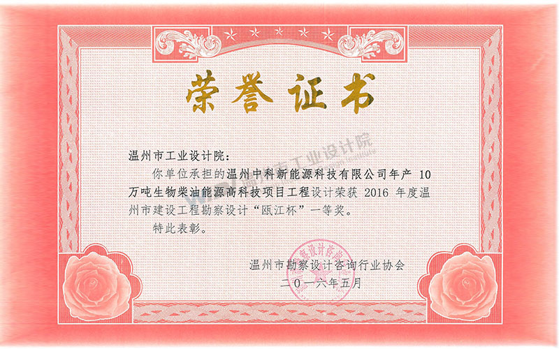 溫州中科新能源科技有限公司年產(chǎn)10萬(wàn)噸生物柴油能源高科技項(xiàng)目 甌江杯一等獎(jiǎng)