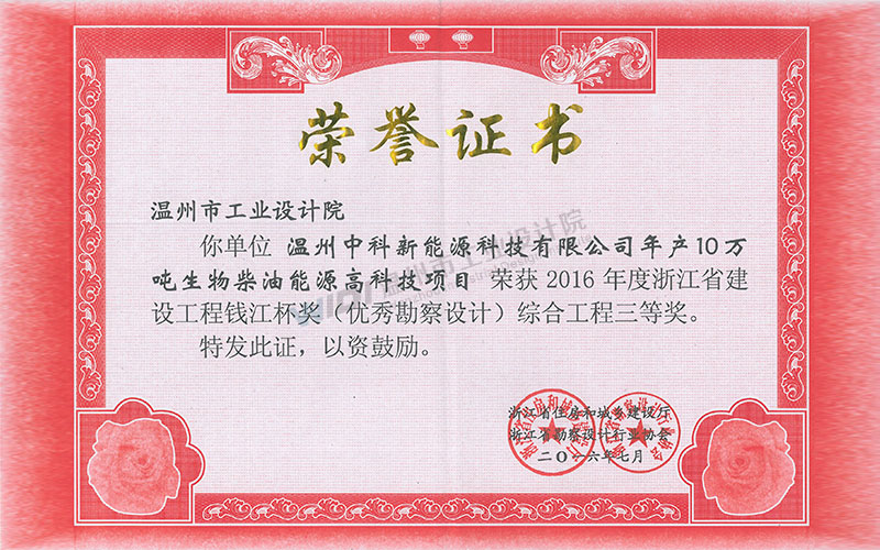 溫州中科新能源科技有限公司年產(chǎn)10萬(wàn)噸生物柴油能源高科技項(xiàng)目 錢(qián)江杯 綜合工程三等獎(jiǎng)