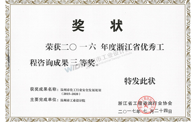 溫州市化工行業(yè)安全發(fā)展規(guī)劃 浙江省優(yōu)秀咨詢(xún)成果三等獎(jiǎng)