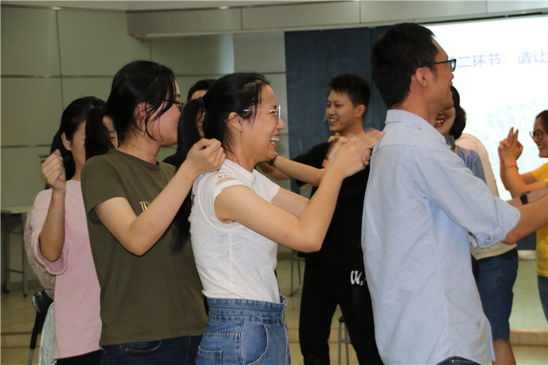 活動(dòng)在勵(lì)志歌曲“追夢(mèng)赤子心”的音樂(lè)聲中拉開(kāi)序幕。大家在指導(dǎo)老師的引領(lǐng)下,分成二個(gè)小組共同進(jìn)入“大風(fēng)吹”“請(qǐng)讓我為你按摩一下下”“優(yōu)點(diǎn)轟炸”“銜紙杯傳水”